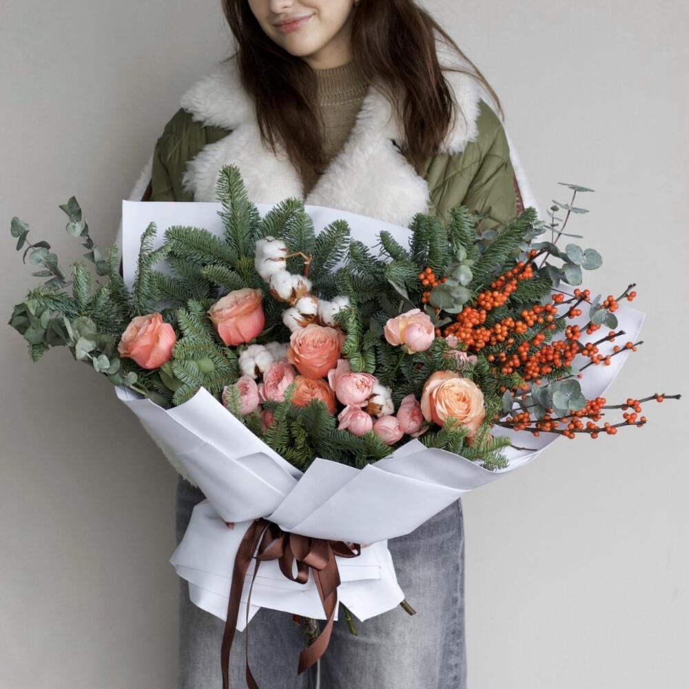 Илекс - 1 шт. Хлопок - 1 шт. Эвкалипт - 1 шт. Пионовидная роза - 5 шт. Нобилис - 1 шт. кустовая роза “джульетта” - 1 шт.